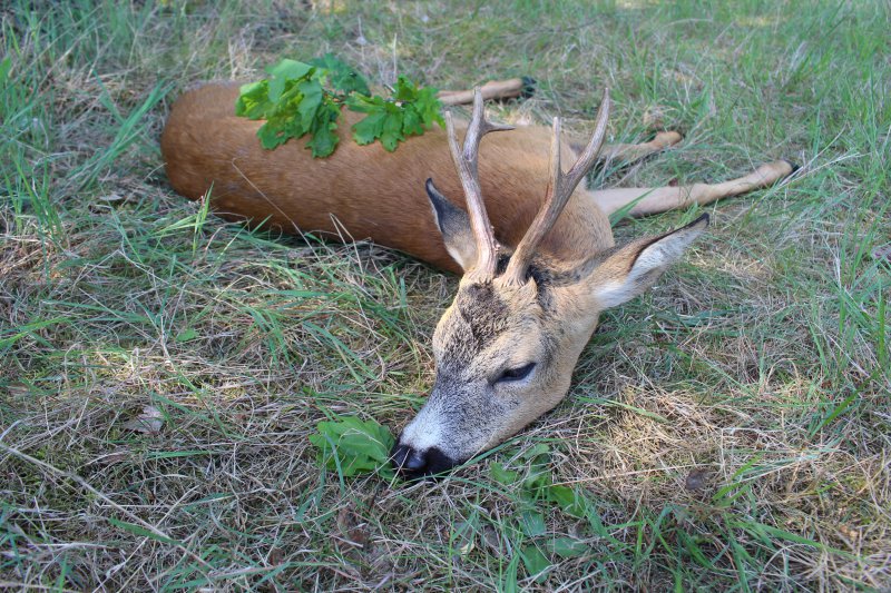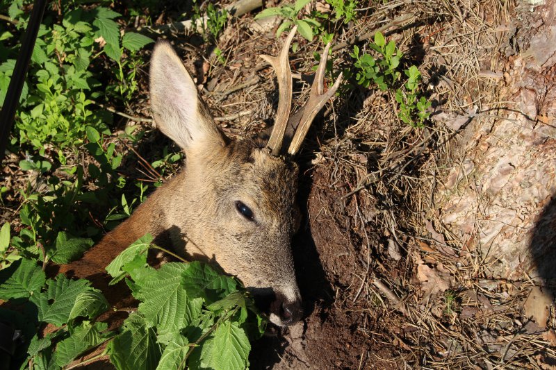 W książce ewidencji pobytu w łowisku zmieniłem rewir bo ten pierwotnie zajęty nie był już dla mnie w tym dniu atrakcyjny. Przemieszczając się w kierunku Mieszuk zauważyłem „terenówki” kolegów myśliwych, a że wcześniej słyszałem strzał wykonałem telefon do Piotrka Naumczuka. Oznajmił mi, że Andrzej Siemieniako strzelał do kozła, który zaznaczył… lecz nie zwalił się w ogniu. Zaproponowałem żeby spróbowali wspomóc się Milą łowczego, która ostatnimi czasy czyni bardzo duże postępy. Ja tymczasem zmieniłem bieg na wyższy aby jak najszybciej dotrzeć na miejsce przerwanego polowania. Przejeżdżając obok świeżych zrębów dostrzegłem sarnę stojącą w paprociach. Odjechałem nie dalej jak 100 m i na poboczu pozostawiłem auto. Energicznym krokiem zbliżyłem się do miejsca, które warunkowało pewny strzał, lornetka do oka, a w niej „ szóstak”. A niech to…Może jestem już trochę zmanierowany ale jeśli szóstak to tylko medalowy !. W przeciwnym razie zdecydowanie bardziej wolę inną formę parostków. Spojarzałem na niego jeszcze raz, w zasadzie tylko po to żeby się z nim pożegnać i dostrzegłem na prawej tyce widlicę. Chwila rozterki. Strzelać czy może jeszcze raz spróbować zapolować na szydlarza. Widocznie Św. Hubert tak to zaplanował i trzeba skorzystać z jego podarunku. Dokładnie przymierzyłem i polowanie zakończone sukcesem.